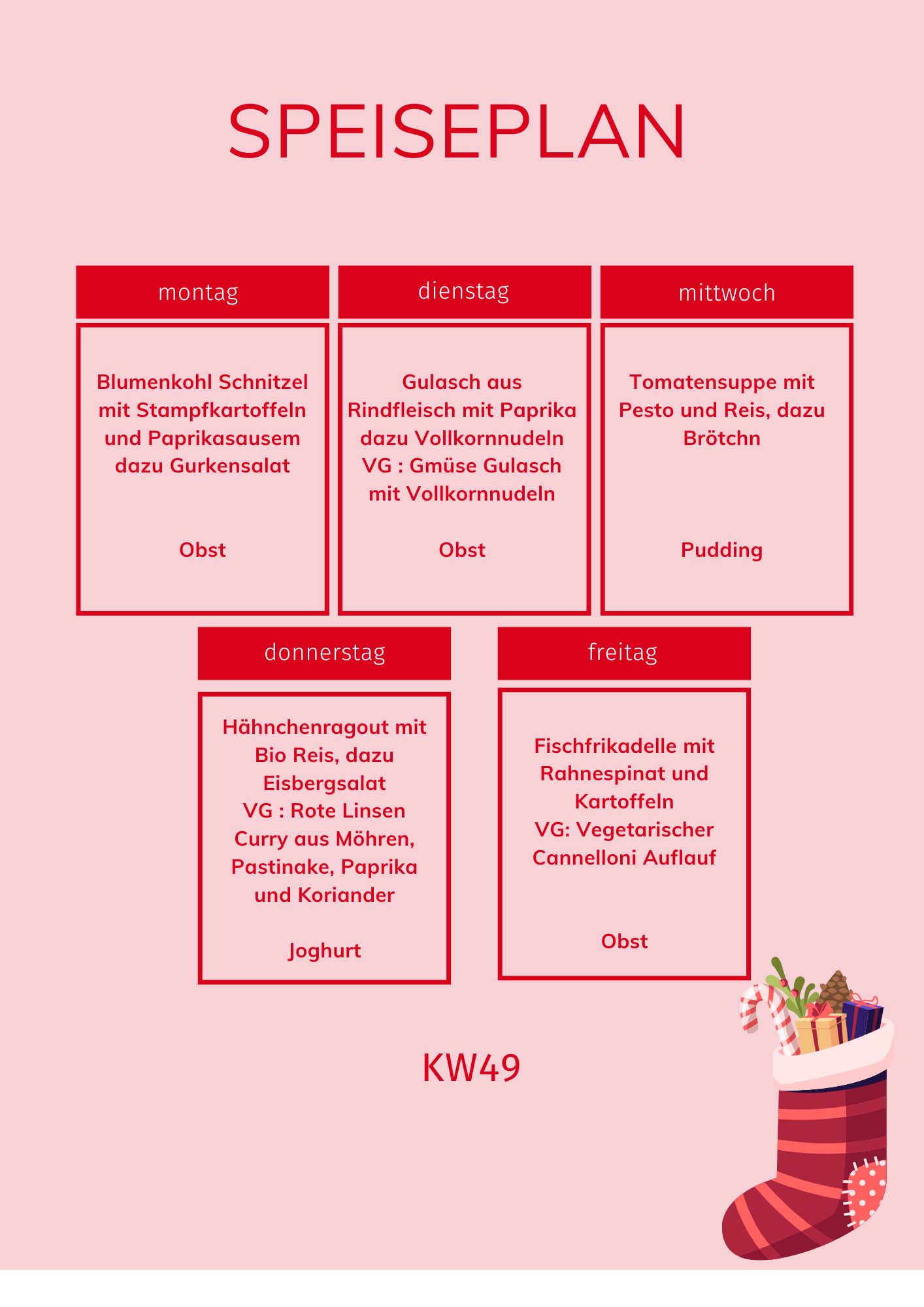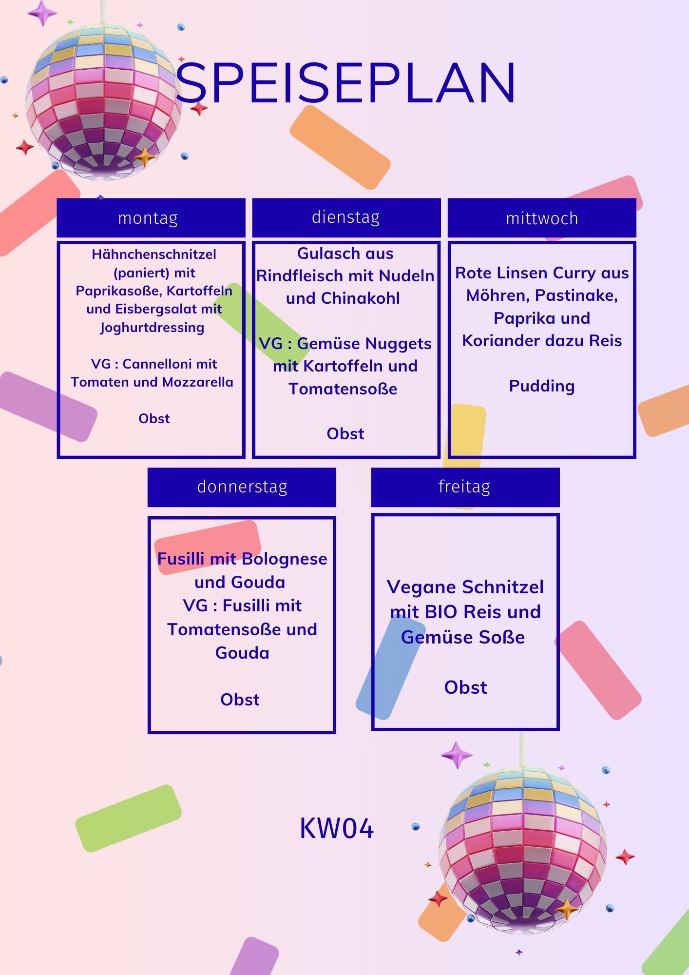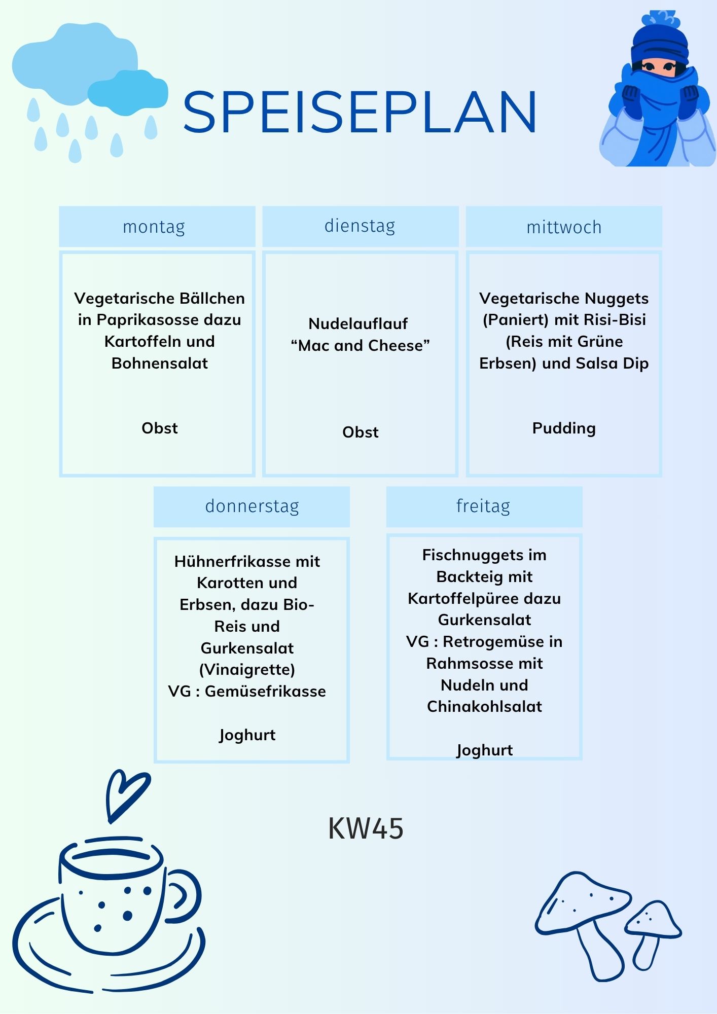 Les repas de la cantine chaude sont composés d’une entrée de crudités, d’un plat et d’un dessert. Les enfants sont impliqués à tour de rôle dans le choix des menus.